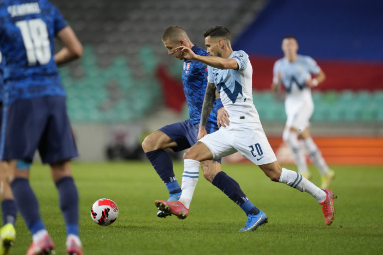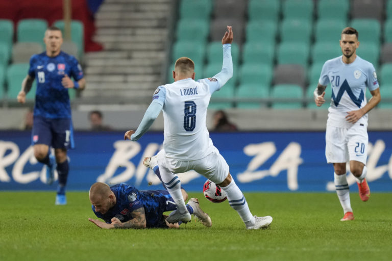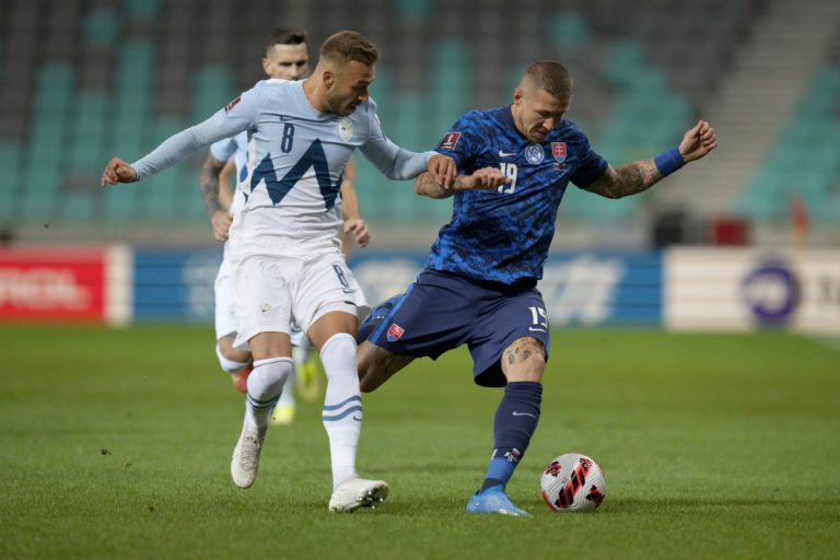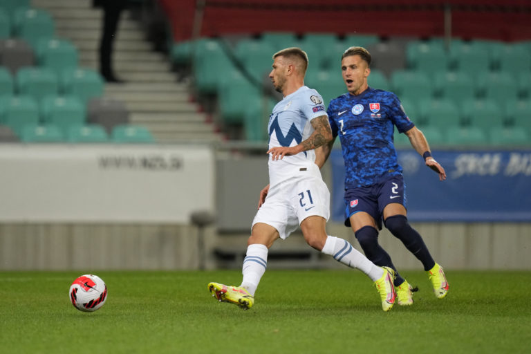 Slovinský reprezentant Sandi Lovrič v súboji so Slovákom Vladimírom Weissom počas zápasu H-skupiny európskej časti kvalifikácie o postup na MS 2022. Ľubľana (Štadión Stožice), 1. september 2021. Foto: SITA/AP.