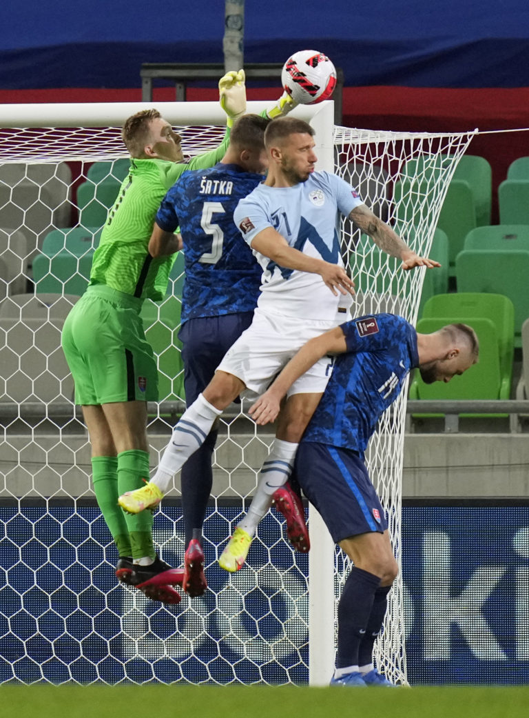 Slovenský gólman Marek Rodák "boxuje" loptu počas zápasu H-skupiny európskej časti kvalifikácie o postup na MS 2022 proti Slovinsku. Ľubľana (Štadión Stožice), 1. september 2021. Foto: SITA/AP