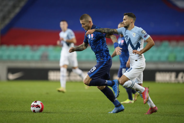 Slovinec Petar Stojanovič sa snaží zastaviť slovenského reprezentanta Juraja Kucku počas zápasu H-skupiny európskej časti kvalifikácie o postup na MS 2022. Ľubľana (Štadión Stožice), 1. september 2021. Foto: SITA/AP.