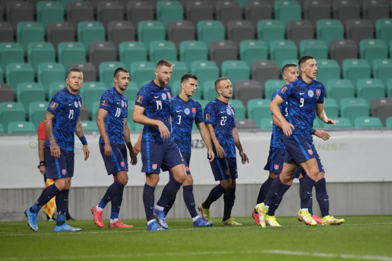 Slovenský futbalisti po góle Róberta Boženíka počas zápase H-skupiny európskej časti kvalifikácie o postup na MS 2020 proti Slovinsku. Ľubľana (Štadión Stožice), 1. september 2021. Foto: SITA/AP.