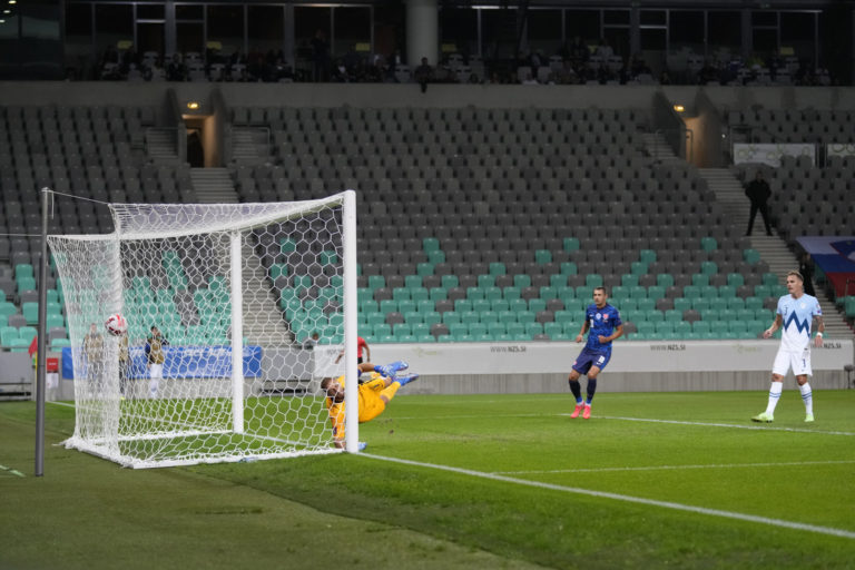 Lopta po strele slovenského reprezentanta Róberta Boženíka skončila za chrbtom slovinského gólmana Jana Oblaka počas zápasu H-skupiny európskej časti kvalifikácie o postup na MS 2022. Ľubľana (Štadión Stožice), 1. september 2021. Foto: SITA/AP.