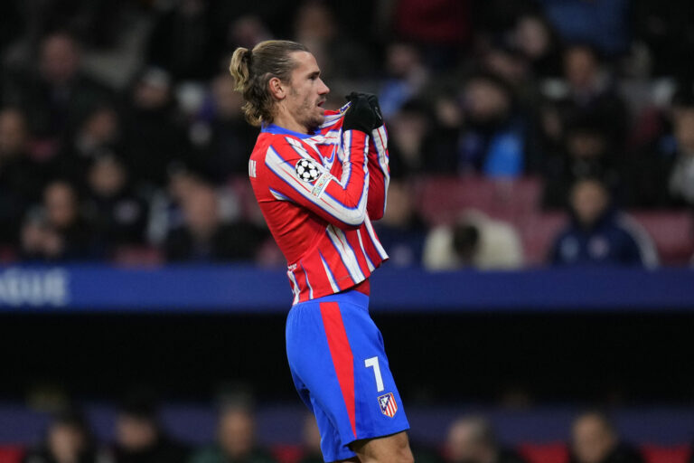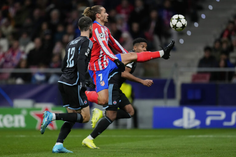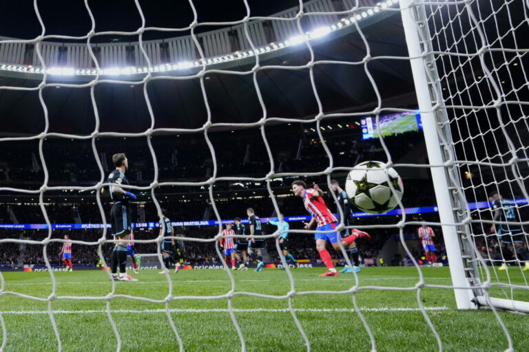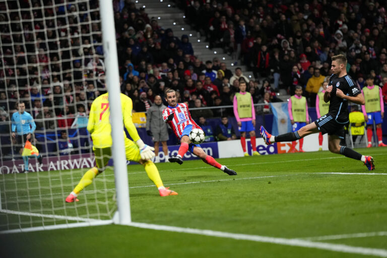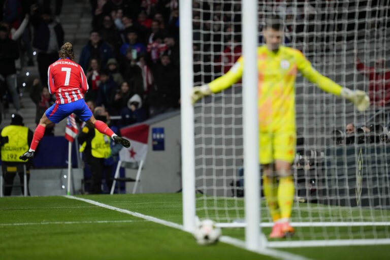 Zakončenie Antoina Griezmanna (Atlético Madrid) v zápase proti Slovanu Bratislava v hlavnej fáze Ligy majstrov 2024/2025. Madrid (Wanda Metropolitano), 11. december 2024. Foto: SITA/AP.