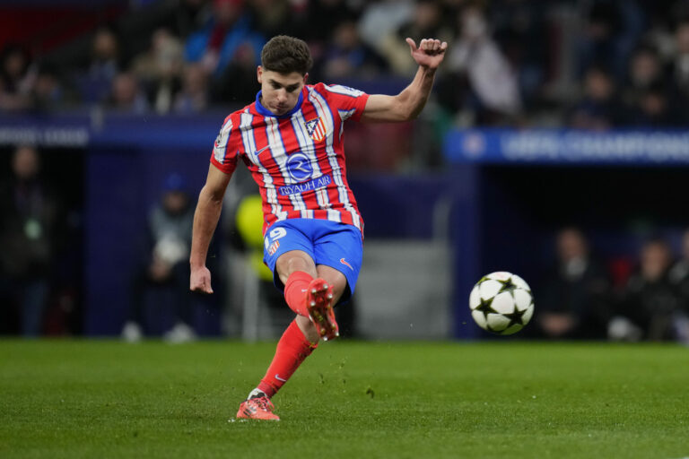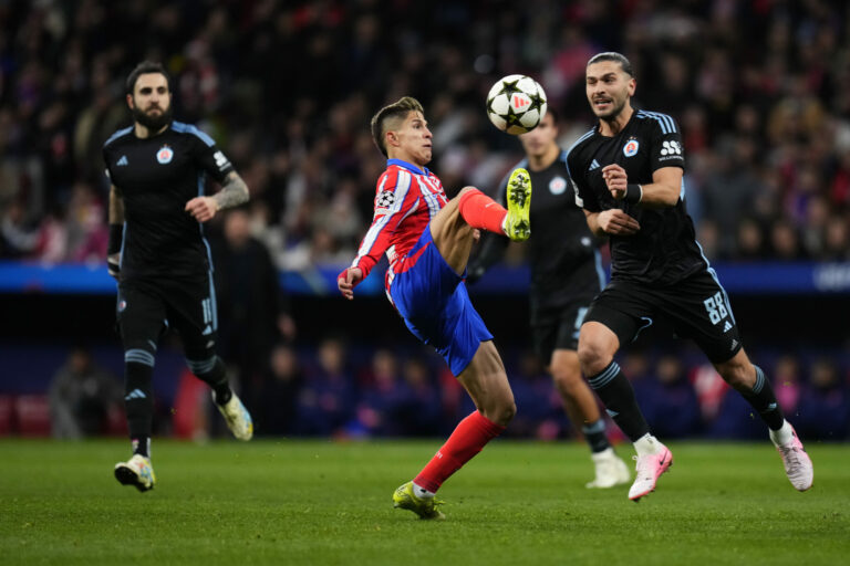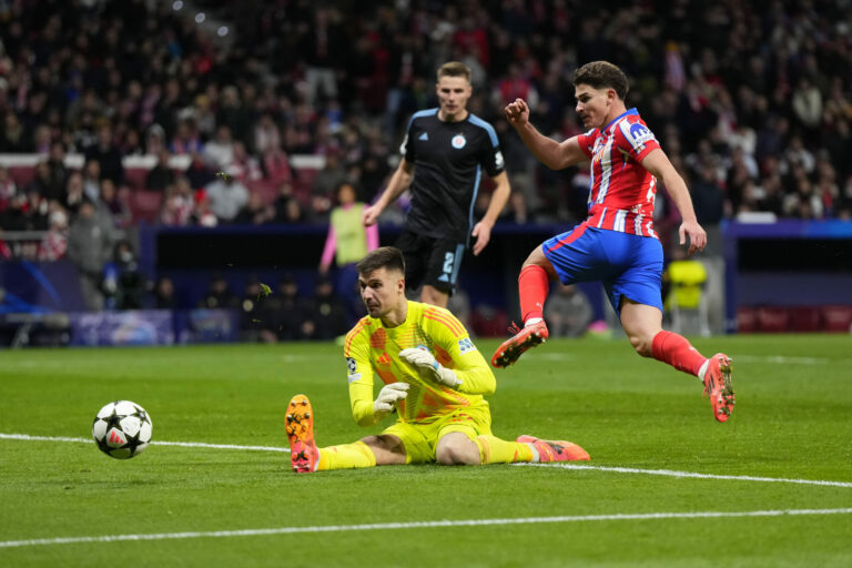 Zakončenie Juliana Álvareza (Atlético Madrid) v zápase proti Slovanu Bratislava v hlavnej fáze Ligy majstrov 2024/2025. Madrid (Wanda Metropolitano), 11. december 2024. Foto: SITA/AP.