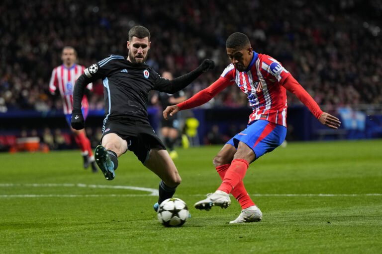 Kenan Bajrić zo Slovana Bratislava a Samuel Lino z Atlética Madrid počas zápasu hlavnej fázy Ligy majstrov 2024/2025. Madrid (Wanda Metropolitano), 11. december 2024. Foto: SITA/AP.