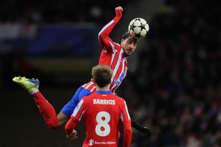 Hlavička Josého Jimenéza (Atlético Madrid) v zápase proti Slovanu Bratislava v hlavnej fáze Ligy majstrov 2024/2025. Madrid (Wanda Metropolitano), 11. december 2024. Foto: SITA/AP.