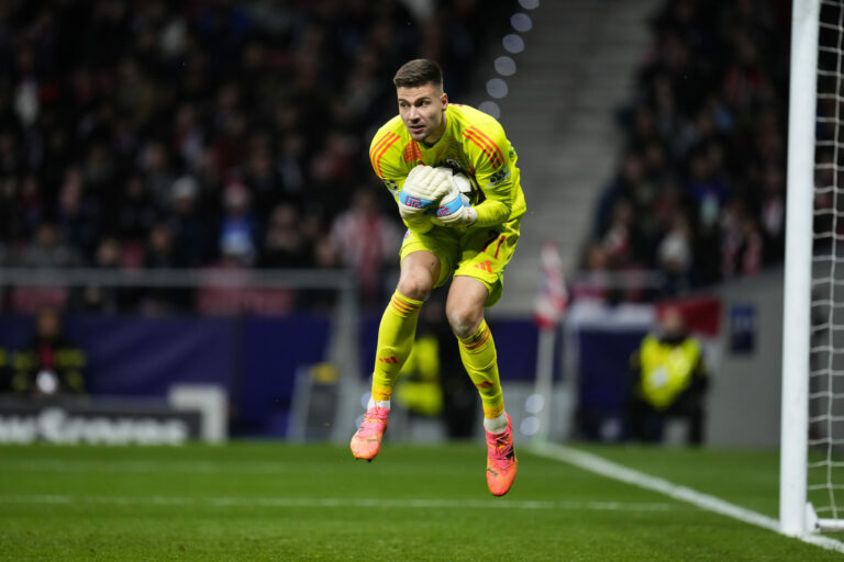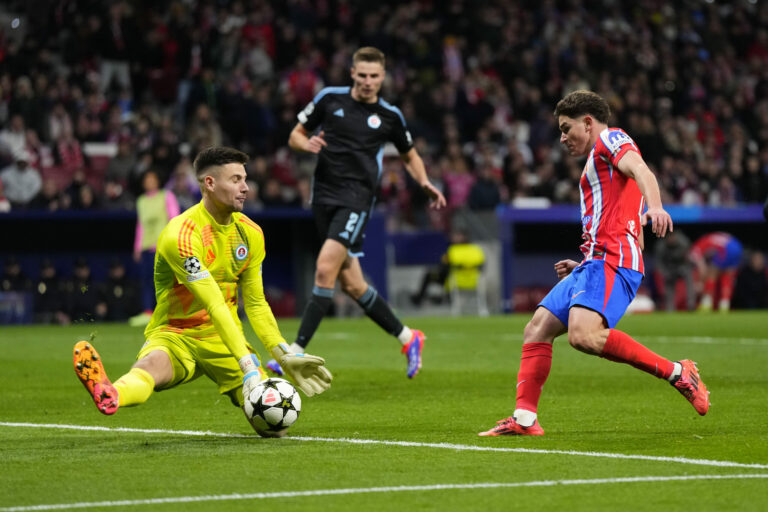 Zákrok brankára Dominika Takáča (Slovan Bratislava) v zápase proti Atléticu Madrid v hlavnej fáze Ligy majstrov 2024/2025. Madrid (Wanda Metropolitano), 11. december 2024. Foto: SITA/AP.