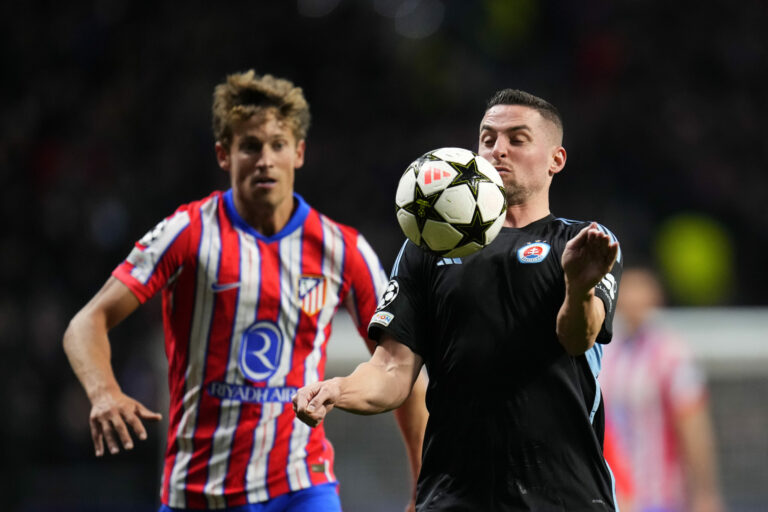 Róbert Mak (Slovan Bratislava) si spracováva loptu pred Marcosom Llorentem (Atlético Madrid) počas zápasu hlavnej fázy Ligy majstrov 2024/2025. Madrid (Wanda Metropolitano), 11. december 2024. Foto: SITA/AP.