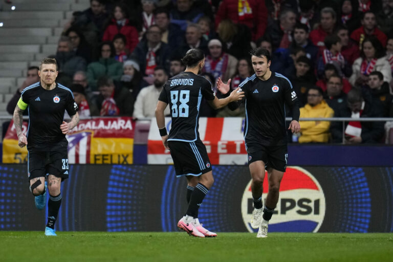 Dávid Strelec sa so spoluhráčom Kyriakosom Savvidisom teší z premenenej penalty v zápase hlavnej fázy Ligy majstrov 2024/2025 v ktorom Slovan Bratislava prehral na pôde Atlética Madrid 1:3. Madrid (Wanda Metropolitano), 11. december 2024. Foto: SITA/AP.