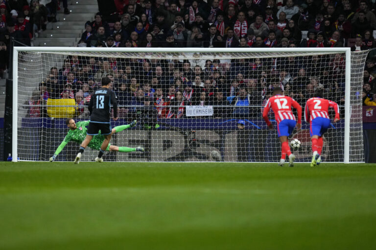 Dávid Strelec (Slovan Bratislava) premieňa pokutový kop v zápase proti Atléticu Madrid v hlavnej fáze Ligy majstrov 2024/2025. Madrid (Wanda Metropolitano), 11. december 2024. Foto: SITA/AP.