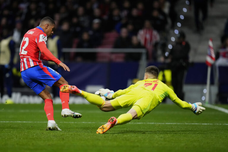Zákrok brankára Dominika Takáča (Slovan Bratislava) po zakončení Samuela Lina (Atlético Madrid) počas zápasu hlavnej fázy Ligy majstrov 2024/2025. Madrid (Wanda Metropolitano), 11. december 2024. Foto: SITA/AP.