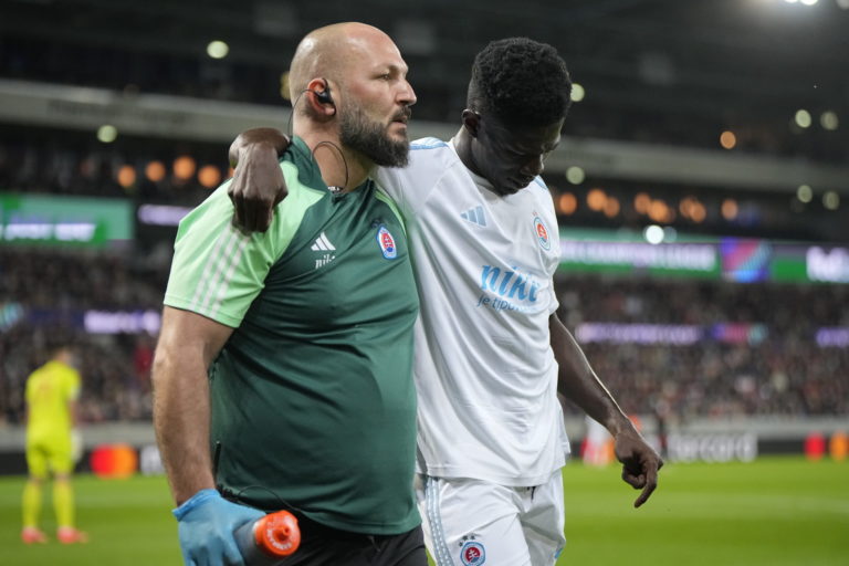 Zranený Sharani Zuberu (Slovan Bratislava) opúšťa trávnik počas prvého polčasu na pôde dánskeho FC Midtjylland v úvodnom zápase play-off o účasť v hlavnej fáze Ligy majstrov 2024/2025. Herning, 21. august 2024. Foto: Bo Amstrup/Ritzau Scanpix via AP.