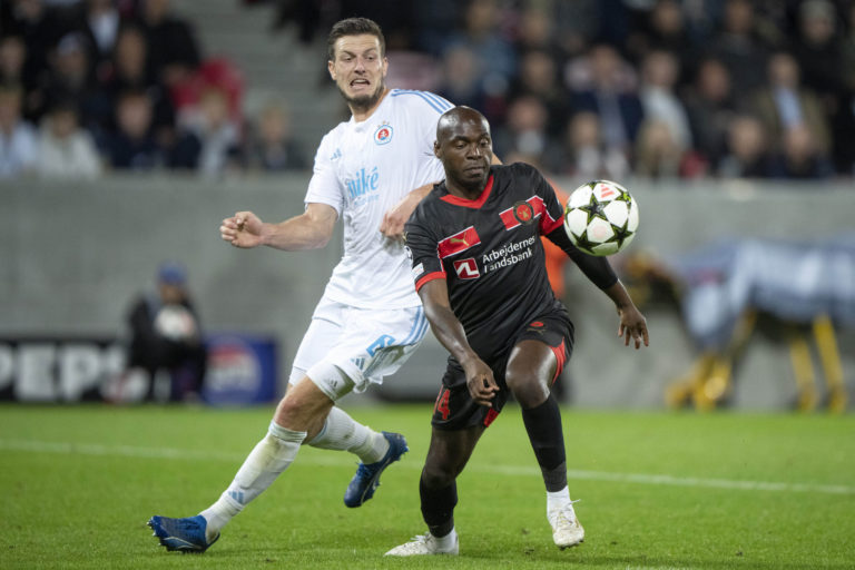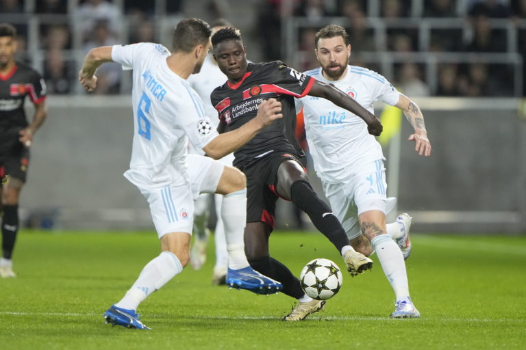 Ousmane Diao )FC Midtjylland) v hlavičkovom súboji s hráčmi Slovana Bratislava v úvodnom zápase play-off o účasť v hlavnej fáze Ligy majstrov 2024/2025. Herning, 21. august 2024. Foto: Bo Amstrup/Ritzau Scanpix via AP.