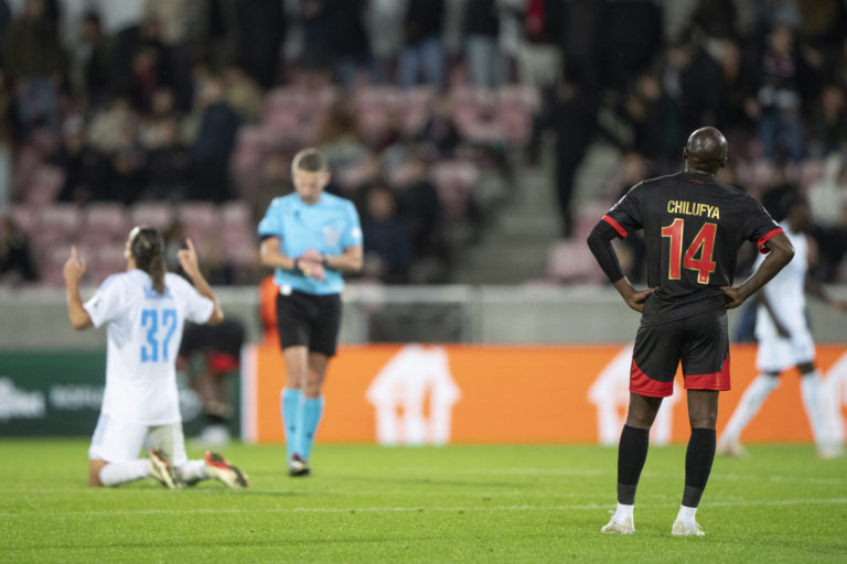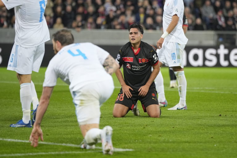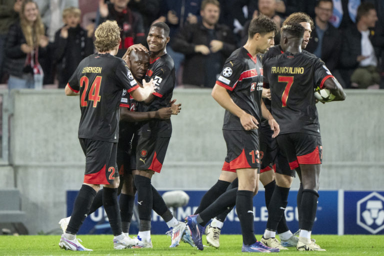 Hráči FC Midtjylland po úvodnom zápase play-off o účasť v hlavnej fáze Ligy majstrov 2024/2025, v ktorom remizovali so Slovanom Bratislava 1:1. Herning, 21. august 2024. Foto: Bo Amstrup/Ritzau Scanpix via AP.