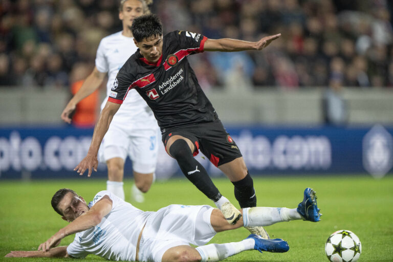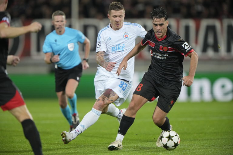 Kevin Wimmer (Slovan Bratislava) sa snaží zastaviť Daria Osoria (FC Midtjylland) počas úvodného zápasu play-off o účasť v hlavnej fáze Ligy majstrov 2024/2025. Herning, 21. august 2024. Foto: Bo Amstrup/Ritzau Scanpix via AP.