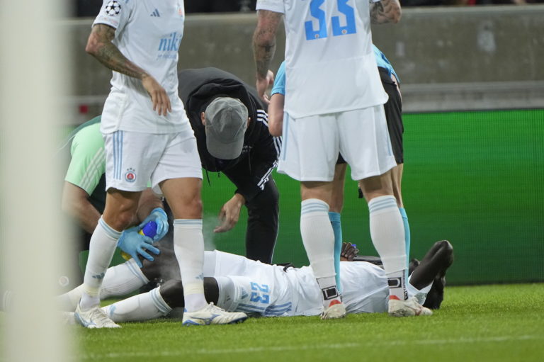 Zranený Sharani Zuberu (Slovan Bratislava) počas zápasu proti FC Midtjylland v úvodnom zápase play-off o účasť v hlavnej fáze Ligy majstrov 2024/2025. Herning, 21. august 2024. Foto: Bo Amstrup/Ritzau Scanpix via AP.