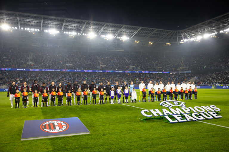 Hráči AC Miláno a Slovana Bratislava pred začiatkom zápasu 5. kola ligovej fázy Ligy majstrov 2024/2025. Bratislava, 26. november 2024. Foto: SITA/Jana Birošová