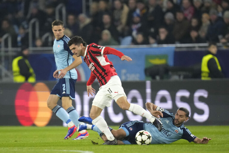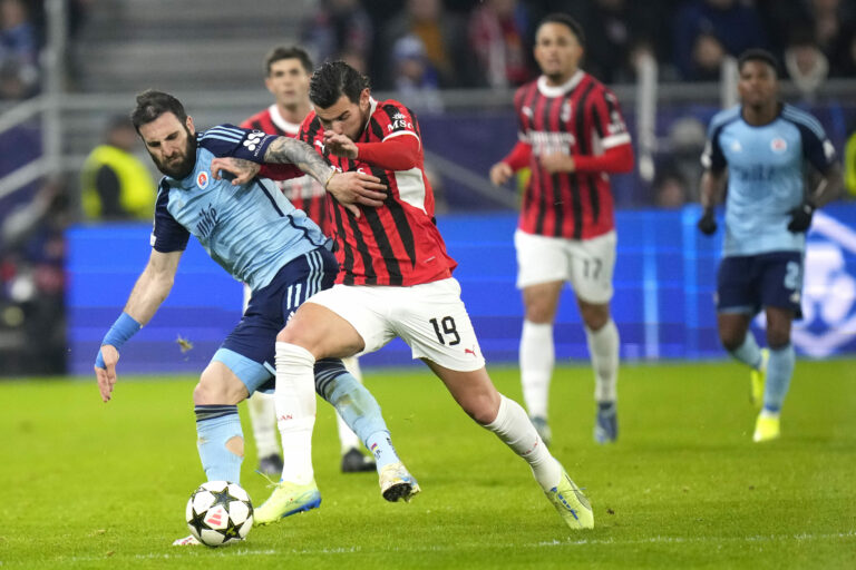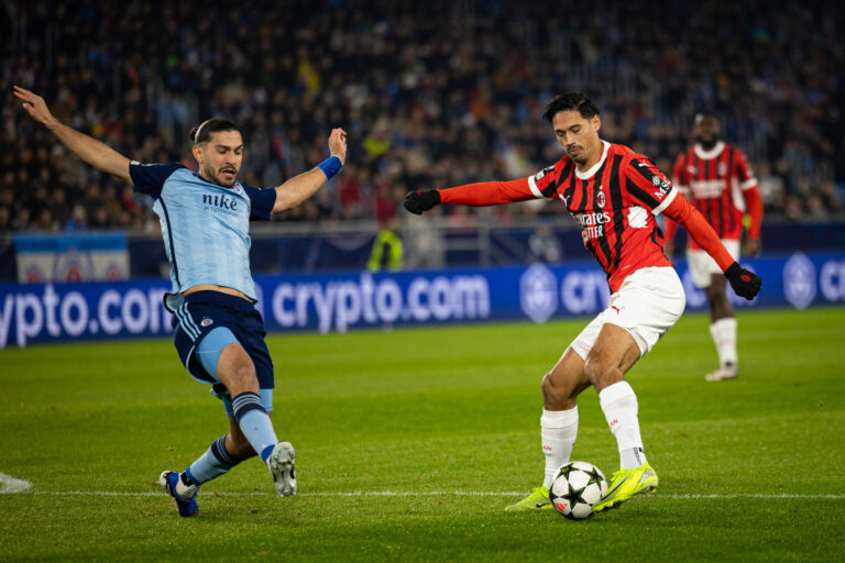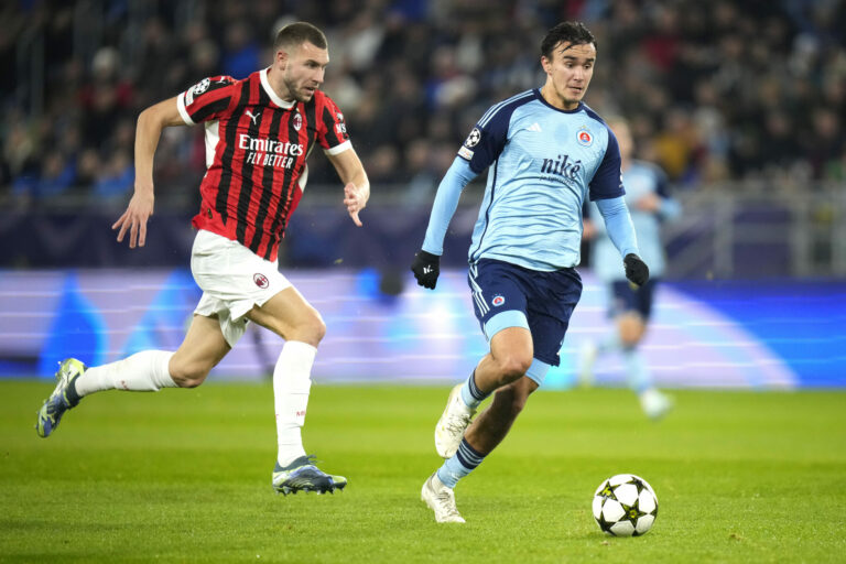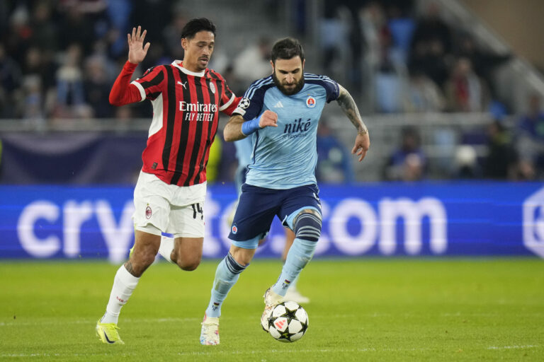 Tijjani Reijnders z AC Miláno (vpredu) spracováva loptu pred Kyriakosom Savvidisom zo Slovana Bratislava počas zápasu 5. kola ligovej fázy Ligy majstrov 2024/2025. Bratislava, 26. november 2024. Foto: SITA/AP
