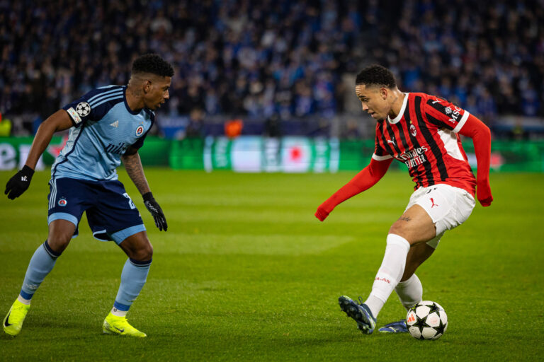 Cesar Blackman zo Slovana Bratislava (vľavo) a Noah Okafor z AC Miláno počas zápasu 5. kola ligovej fázy Ligy majstrov 2024/2025. Bratislava, 26. november 2024. Foto: SITA/Jana Birošová