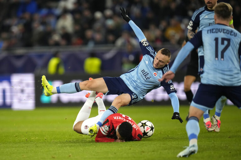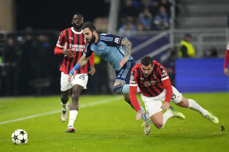 Nino Marcelli zo Slovana Bratislava padá cez Rubena Loftus-Cheeka z AC Miláno počas zápasu 5. kola ligovej fázy Ligy majstrov 2024/2025. Bratislava, 26. november 2024. Foto: SITA/AP