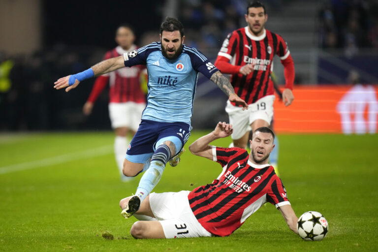 Marko Tolić zo Slovana Bratislava dostal od rozhodcu červenú kartu počas zápasu 5. kola ligovej fázy Ligy majstrov 2024/2025 proti AC Miláno. Bratislava, 26. november 2024. Foto: SITA/AP