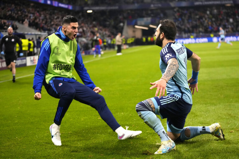 Tigran Barseghjan zo Slovana Bratislava (vpravo) sa raduje zo svojho gólu v sieti AC Miláno počas zápasu 5. kola ligovej fázy Ligy majstrov 2024/2025. Bratislava, 26. november 2024. Foto: SITA/AP