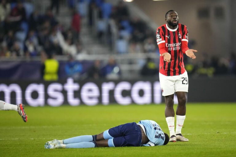 Youssouf Fofana z AC Miláno (vpravo) reaguje na verdikt rozhodcu po faule na hráča Slovana Bratislava počas zápasu 5. kola ligovej fázy Ligy majstrov 2024/2025. Bratislava, 26. november 2024. Foto: SITA/AP