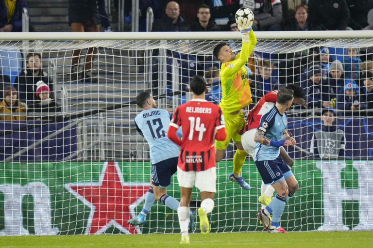 Brankár Slovana Bratislava Dominik Takáč chytá loptu počas zápasu 5. kola ligovej fázy Ligy majstrov 2024/2025 proti AC Miláno. Bratislava, 26. november 2024. Foto: SITA/AP
