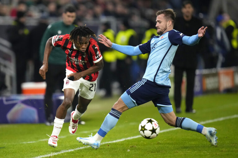 Samuel Chukwueze z AC Miláno (vľavo) uniká po čiare Jurijovi Medveděvovi počas zápasu 5. kola ligovej fázy Ligy majstrov 2024/2025. Bratislava, 26. november 2024. Foto: SITA/AP