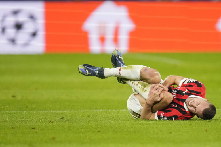 Strahinja Pavlović z AC Miláno leží na trávniku počas zápasu 5. kola ligovej fázy Ligy majstrov 2024/2025 proti Slovanu Bratislava. Bratislava, 26. november 2024. Foto: SITA/AP