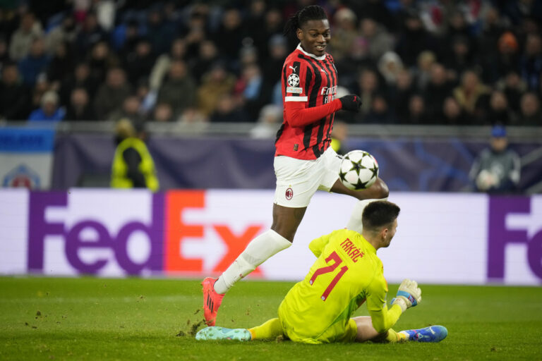 Rafael Leao z AC Miláno prekonáva brankára Slovana Bratislava Dominika Takáča počas zápasu 5. kola ligovej fázy Ligy majstrov 2024/2025. Bratislava, 26. november 2024. Foto: SITA/AP