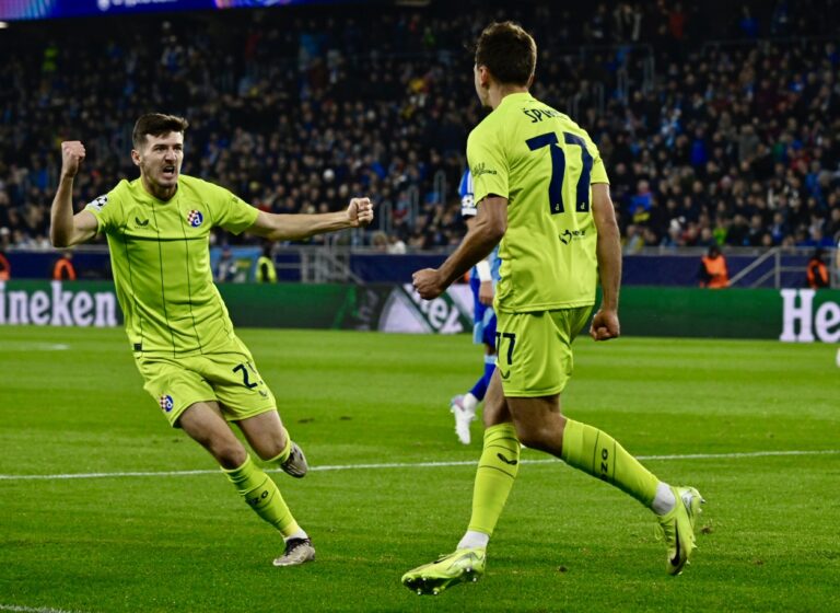 Hráči z GNK Dinamo Záhreb sa tešia po góle 1:1 počas futbalového zápasu hlavnej fázy Ligy majstrov UEFA 2024/2025 medzi ŠK Slovan Bratislava - GNK Dinamo Záhreb. Bratislava, 5. november 2024. Foto: SITA/Milan Illík