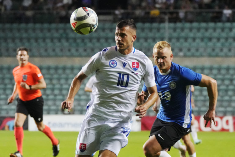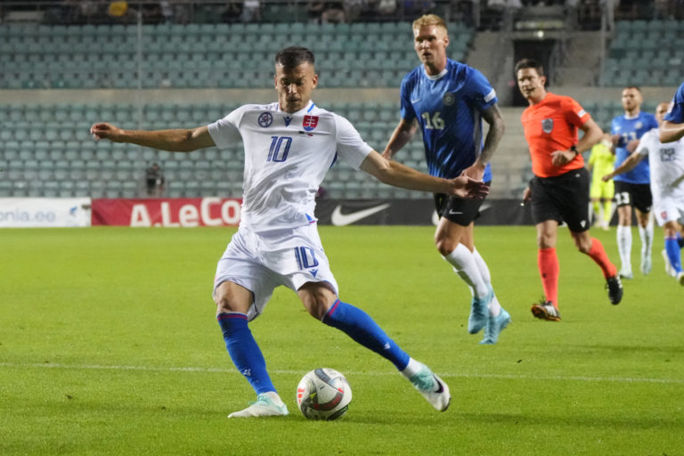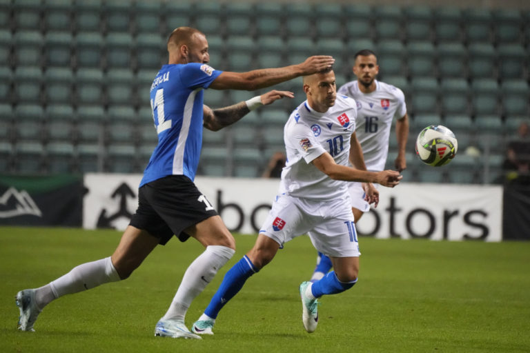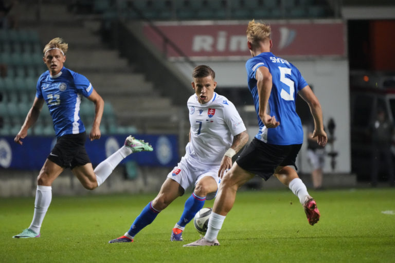 Slovenský reprezentant László Bénes počas zápasu proti Estónsku v 1. skupine C-divízie Ligy národov. Tallin, 5. september 2024. Foto: SITA/AP.