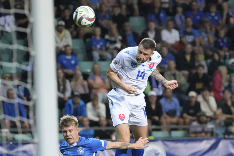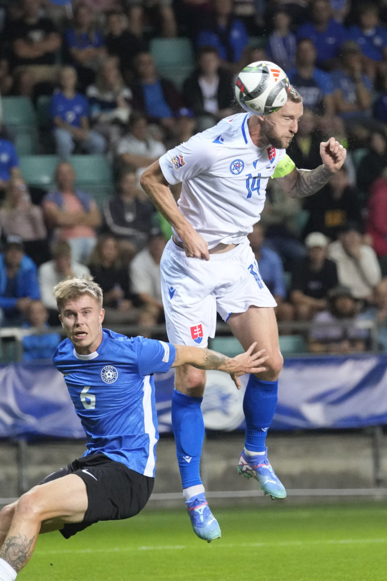 Slovenský reprezentant Milan Škriniar hlavičkuje loptu v zápase proti Estónsku v 1. skupine C-divízie Ligy národov. Tallin, 5. september 2024. Foto: SITA/AP.