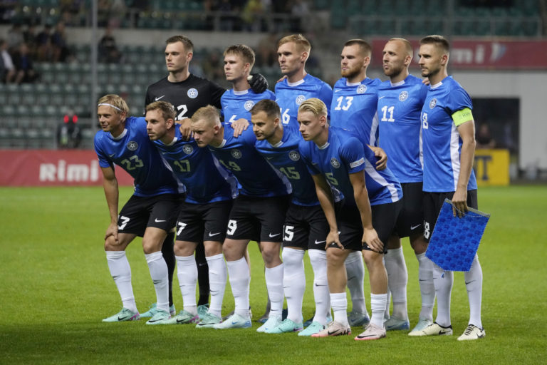 Futbalisti Estónska pred zápasom proti Slovensku v 1. skupine C-divízie Ligy národov. Tallin, 5. september 2024. Foto: SITA/AP.