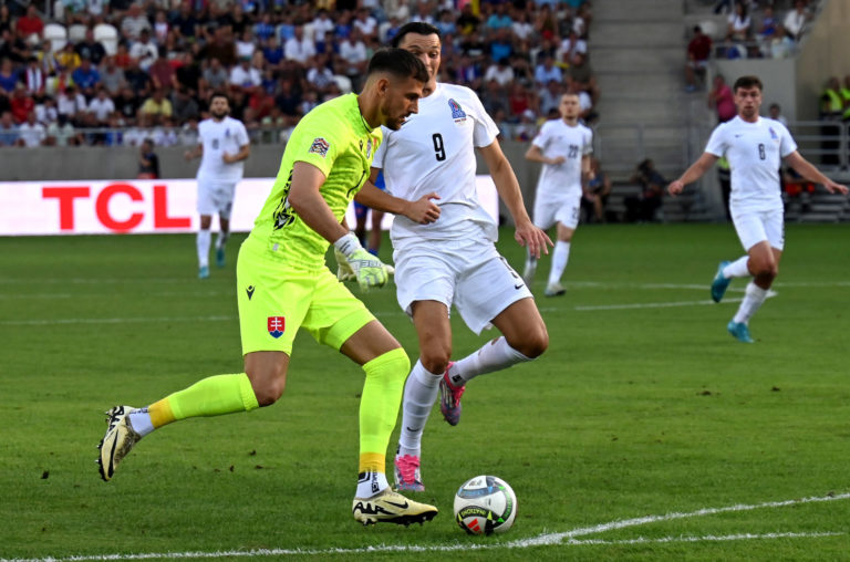 Zľava: Brankár Martin Dúbravka zo Slovenska a Renat Dadashov z Azerbajdžanu počas futbalového zápasu 2. kola C-divízie Ligy národov medzi Slovensko - Azerbajdžan. Košice, 8. september 2024. Foto: SITA/Viktor Zamborský.