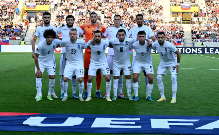 Reprezentácia hráčov z Azerbajdžanu pred začatím futbalového zápasu 2. kola C-divízie Ligy národov Ligy národov medzi Slovensko - Azerbajdžan. Košice, 8. september 2024. Foto: SITA/Viktor Zamborský