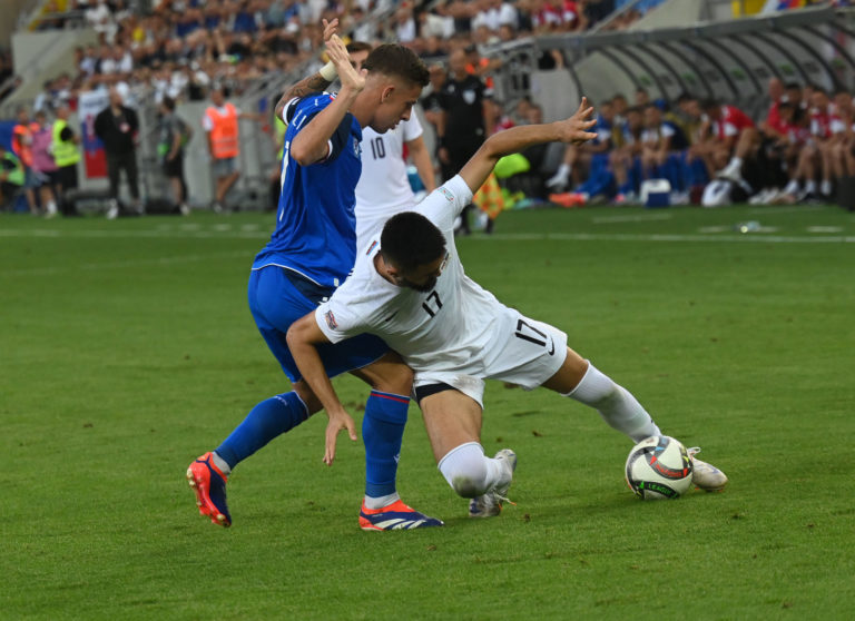 V popredí zľava: Ondrej Duda zo Slovenska a Elvin Jamalov z Azerbajdžanu počas futbalového zápasu 2. kola C-divízie Ligy národov medzi Slovensko - Azerbajdžan. Košice, 8. september 2024. Foto: SITA/Viktor Zamborský
