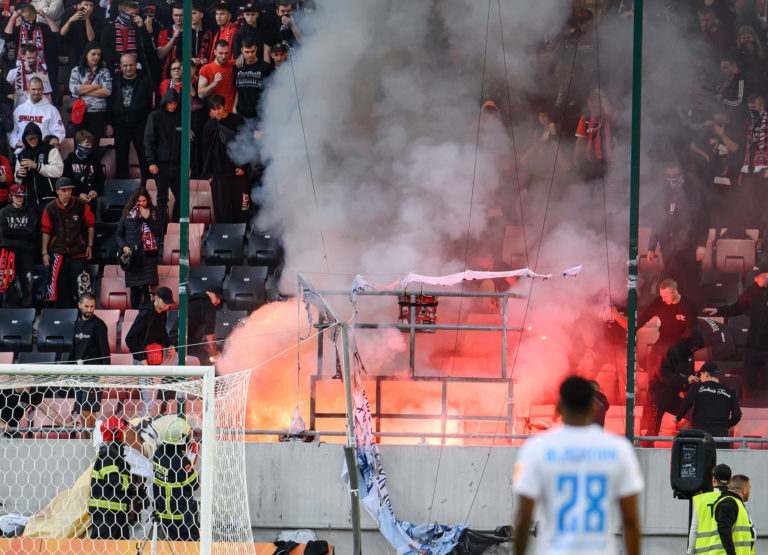Ohňostroj od fanúšikov FC Spartak Trnava počas futbalového zápasu 11. kola Niké ligy 2023/2024 medzi FC Spartak Trnava - ŠK Slovan Bratislava. Trnava, 22. október 2023. Foto: SITA/Martin Havran.