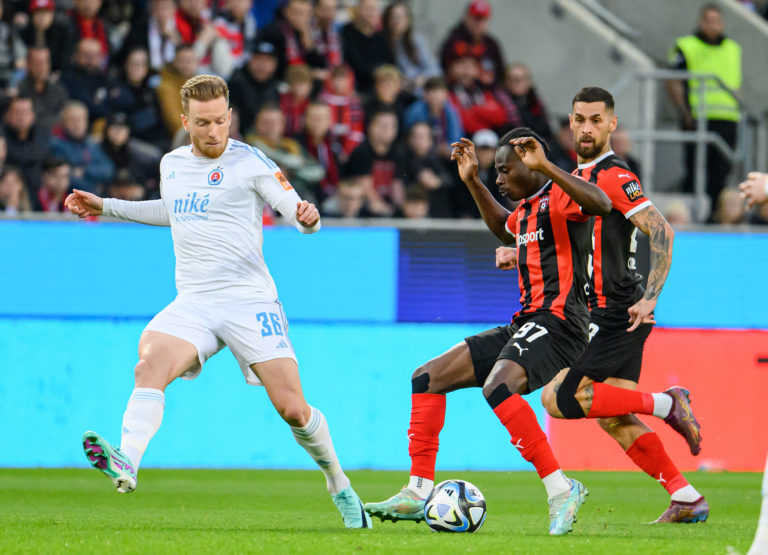 Kelvin Ofori z FC Spartak Trnava (v strede) a Lucas Lovat z ŠK Slovan Bratislava (vľavo) počas futbalového zápasu 11. kola Niké ligy 2023/2024 medzi FC Spartak Trnava - ŠK Slovan Bratislava. Trnava, 22. október 2023. Foto: SITA/Martin Havran.