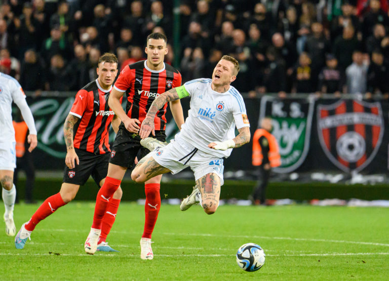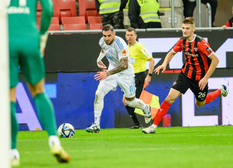 Tigran Barseghjan z ŠK Slovan Bratislava (vľavo) a Sebastián Kóša z FC Spartak Trnava (vpravo) počas futbalového zápasu 11. kola Niké ligy 2023/2024 medzi FC Spartak Trnava - ŠK Slovan Bratislava. Trnava, 22. október 2023. Foto: SITA/Martin Havran.