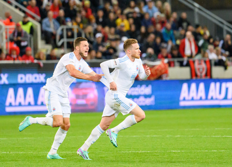 Lucas Lovat z ŠK Slovan Bratislava (vľavo) po strelení gólu počas futbalového zápasu 11. kola Niké ligy 2023/2024 medzi FC Spartak Trnava - ŠK Slovan Bratislava. Trnava, 22. október 2023. Foto: SITA/Martin Havran.