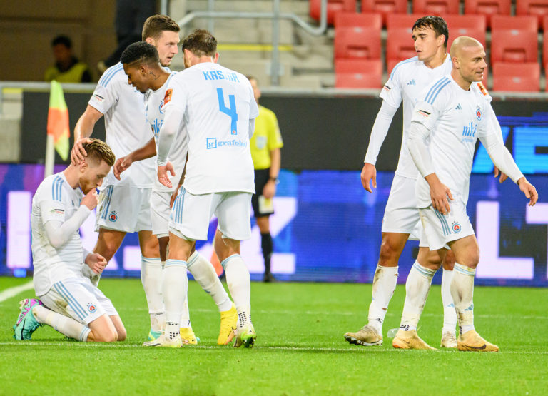 Radoasť hráčov ŠK Slovan Bratislava z úvodného gólu počas futbalového zápasu 11. kola Niké ligy 2023/2024 medzi FC Spartak Trnava - ŠK Slovan Bratislava. Trnava, 22. október 2023. Foto: SITA/Martin Havran