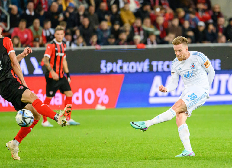 Lucas Lovat z ŠK Slovan Bratislava (vpravo) počas futbalového zápasu 11. kola Niké ligy 2023/2024 medzi FC Spartak Trnava - ŠK Slovan Bratislava. Trnava, 22. október 2023. Foto: SITA/Martin Havran