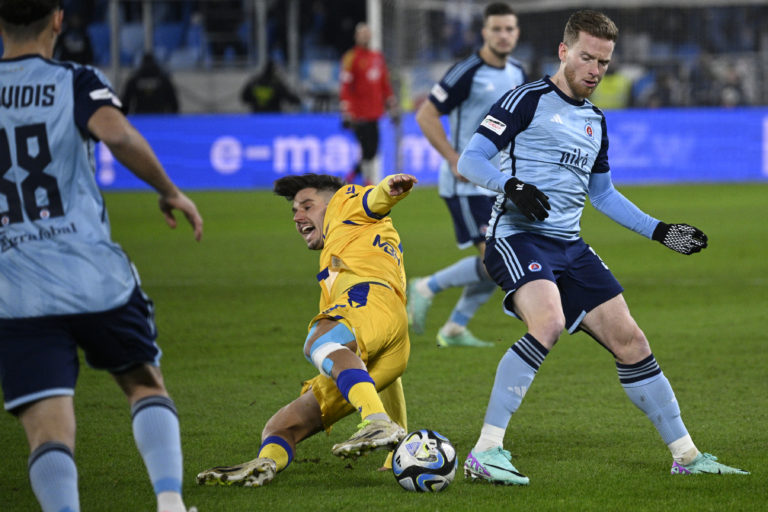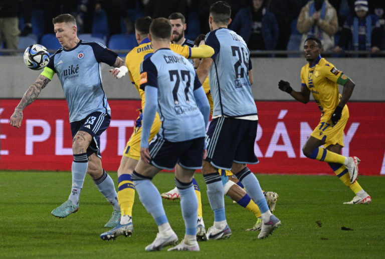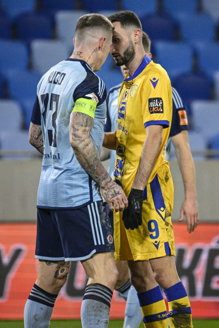 Sprava: Aleš Čermák z FC DAC 1904 Dunajská Streda a Alexandar Čavrič z ŠK Slovan Bratislava počas futbalového zápasu 18. kola Niké ligy 2023/2024 medzi ŠK Slovan Bratislava - FC DAC 1904 Dunajská Streda. Bratislava, 17. december 2023. Foto: SITA/Milan Illík