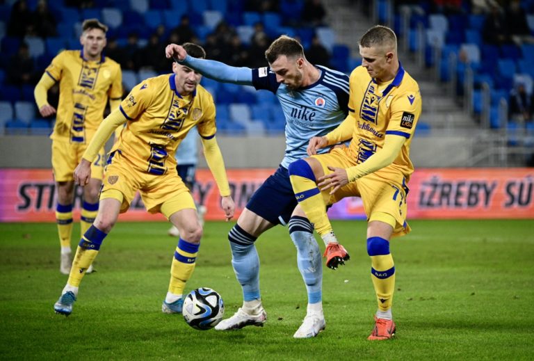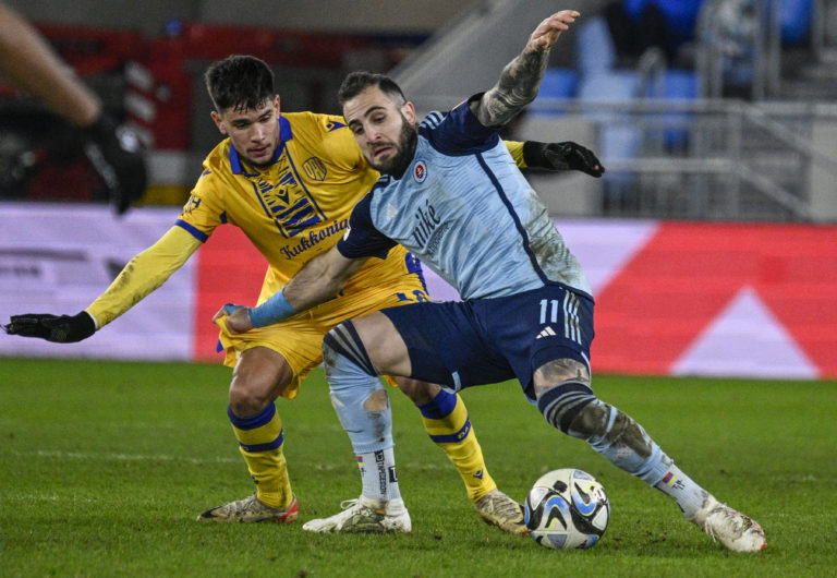 Zľava: Jan Konrad Gruszkowski z FC DAC Dunajská Streda a Jaromír Zmrhal z ŠK Slovan Bratislava počas futbalového zápasu 18. kola Niké ligy 2023/2024 medzi ŠK Slovan Bratislava - FC DAC 1904 Dunajská Streda. Bratislava, 17. december 2023. Foto: SITA/Milan Illík