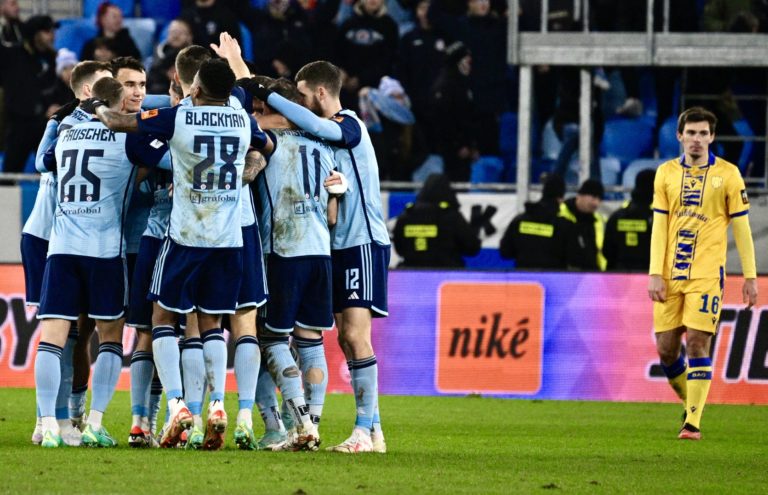 Radosť hráčov z FC DAC 1904 Dunajská Streda po góle 1:1 počas futbalového zápasu 18. kola Niké ligy 2023/2024 medzi ŠK Slovan Bratislava - FC DAC 1904 Dunajská Streda. Bratislava, 17. december 2023. Foto: SITA/Milan Illík