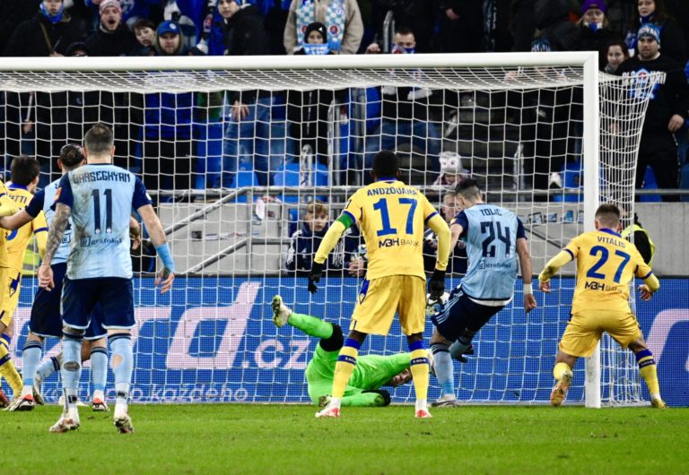 Tigran Barseghja z ŠK Slovan Bratislava (hore) po góle 1:0 počas futbalového zápasu 18. kola Niké ligy 2023/2024 medzi ŠK Slovan Bratislava - FC DAC 1904 Dunajská Streda. Bratislava, 17. december 2023. Foto: SITA/Milan Illík