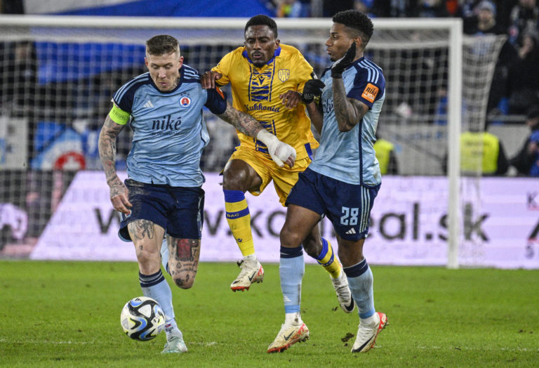 Zľava: Alexandar Popovič z FC DAC 1904 Dunajská Streda, Alexandar Čavrič z ŠK Slovan Bratislava a Filip Kaša z FC DAC 1904 Dunajská Streda počas futbalového zápasu 18. kola Niké ligy 2023/2024 medzi ŠK Slovan Bratislava - FC DAC 1904 Dunajská Streda. Bratislava, 17. december 2023. Foto: SITA/Milan Illík