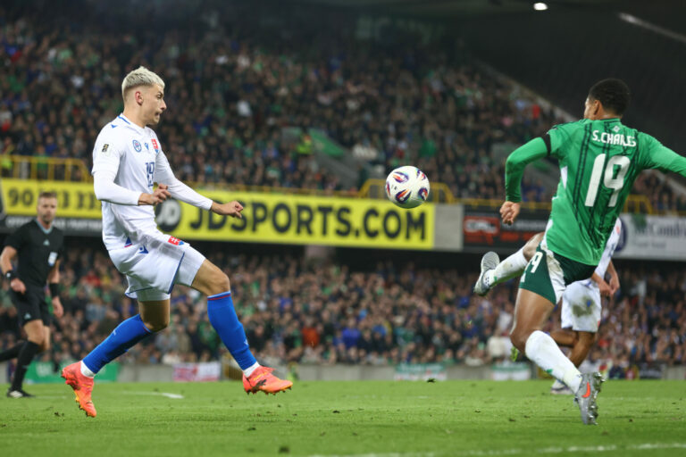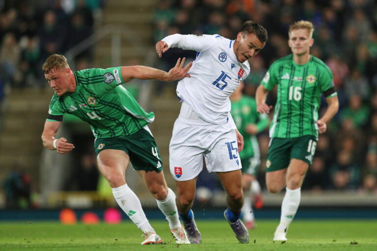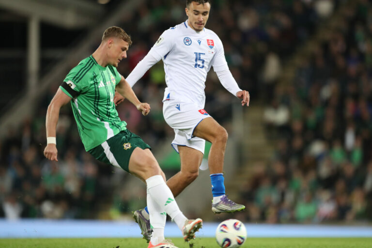 Tomáš Rigo zo Slovenska (vľavo) a Shea Charles zo Severného Írska v akcii počas zápasu A-skupiny kvalifikácie o postup na MS vo futbale 2026. Belfast, 10. október 2025. Foto: SITA/AP