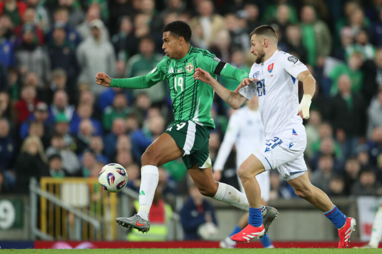 Shea Charles zo Severného Írska (vľavo) a Matúš Bero zo Slovenska v akcii počas zápasu A-skupiny kvalifikácie o postup na MS vo futbale 2026. Belfast, 10. október 2025. Foto: SITA/AP